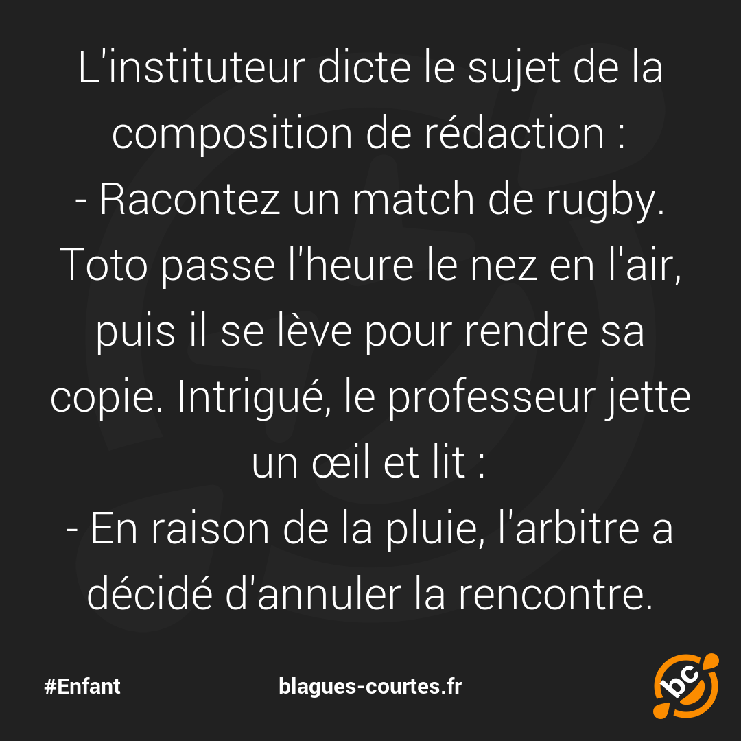 Toto passe l'heure le nez en l'air, puis il se lève pour rendre sa copie. Intrigué, le professeur jette un œil et lit :