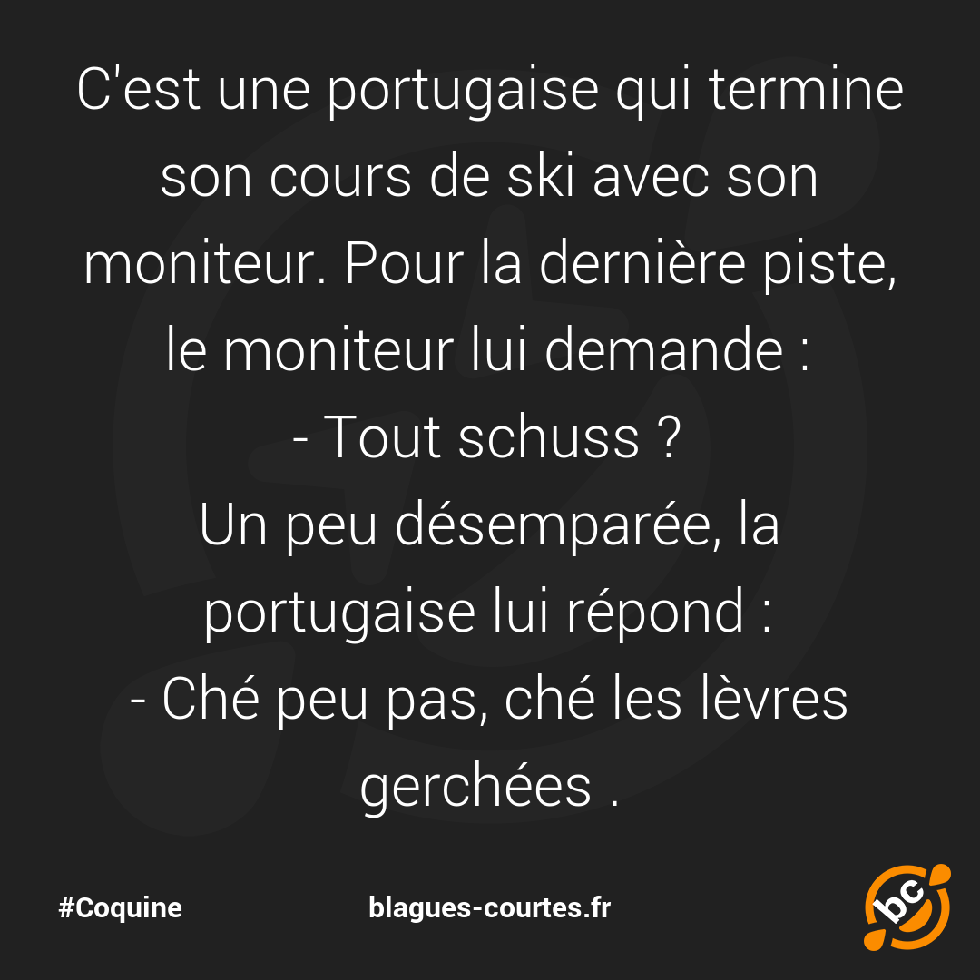 C'est une portugaise qui termine son cours de ski avec son moniteur. Pour la dernière piste, le moniteur lui demande :
