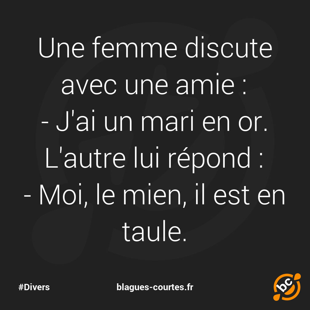 Une femme discute avec une amie : - J'ai un mari en or. L'autre lui répond : - Moi, le mien, il est en taule.