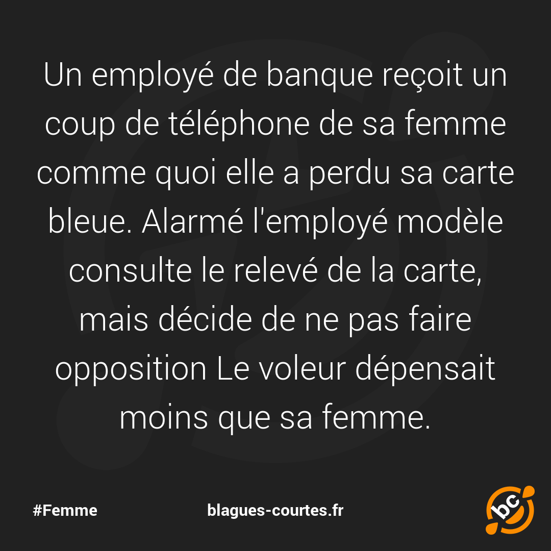 Un employé de banque reçoit un coup de téléphone de sa femme comme quoi elle a perdu sa carte bleue. Alarmé l'employé modèle consulte le relevé de la carte, mais décide de ne pas faire opposition Le voleur dépensait moins que sa femme.