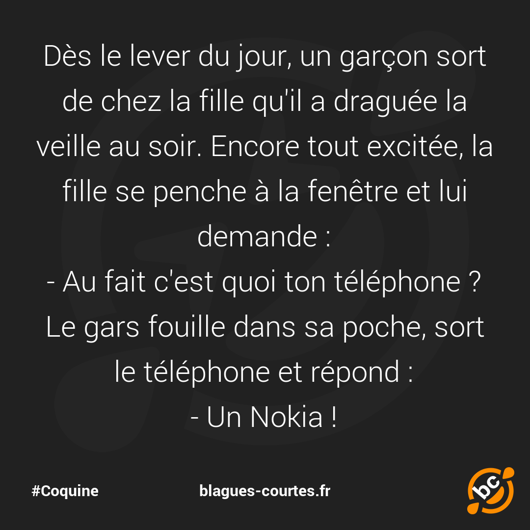 Dès le lever du jour, un garçon sort de chez la fille qu'il a draguée la veille au soir. Encore tout excitée, la fille se penche à la fenêtre et lui demande :