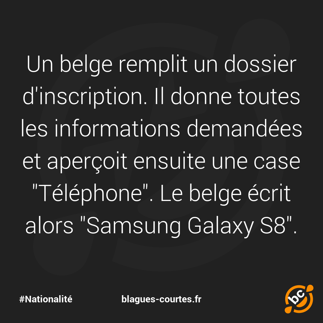 Un belge remplit un dossier d'inscription. Il donne toutes les informations demandées et aperçoit ensuite une case "Téléphone". Le belge écrit alors "Samsung Galaxy S8".