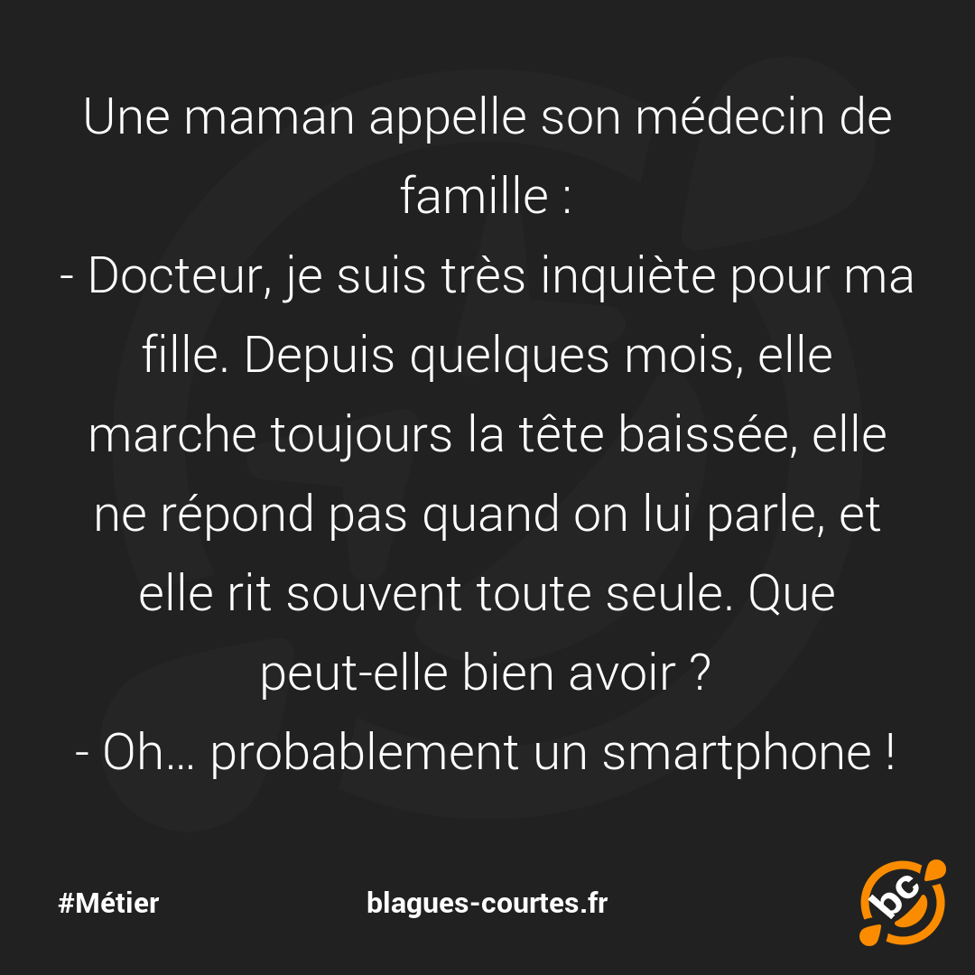 - Docteur, je suis très inquiète pour ma fille. Depuis quelques mois, elle marche toujours la tête baissée, elle ne répond pas quand on lui parle, et elle rit souvent toute seule. Que peut-elle bien avoir ?